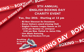 In keeping with the giving spirit of the holidays, we would like to invite you to attend our 🎁 5th Annual Boxing Day Charity Event. 🎁 We are sponsoring the In Jacob's Shoes Charity in Margate FL. to help children and families. In Jacob’s Shoes was formed in honor of the life of Jacob Samuel Zweig who was tragically killed at the age of seventeen on November 15, 2008. In his short life, Jacob touched and inspired so many people. His friendships spanned the globe. The mission of In Jacob’s Shoes is to provide new and gently used shoes, school supplies and athletic gear to local children in need. Grants are also awarded for camp, aftercare, sports and enrichment programs. See their website for more info on what items to donate: https://injacobsshoes.org/wish-list/ Donations of the following new or very gently used items are needed: Sneakers (especially youth sizes 1 & 3) School Backpacks School Supplies (new only) Cleaning Supplies: OxiClean Stain Remover Spray; OxiClean Laundry Powder Soap; Lysol Disinfectant Spray; Disposable Gloves; Towels Shoe Laces and Insoles (new only... all sizes needed) We have a great day of fun and giving planned including: $2 off beer tickets for donations to the charity (one per donor) ⚽ English Premier League Matches Live on our TV screens: 12:30 pm Burnley vs. Liverpool 3:00 pm Manchester United vs. Aston Villa 🥣 We will be serving the “Lighthouse Point Chili Cook Off” award winning chili crafted by Bryan Oulton (while supplies last) 🎵 Live Music 5-8pm with the North End Rockers! We hope to see you all come on out and support this great local charity. Happy Holidays and Cheers!