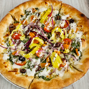 Garlic oil, butternut squash, bell peppers, cherry tomatoes, arugula, kalamata olives, red onions, mozzarella cheese, lime aioli. Can be made vegan.